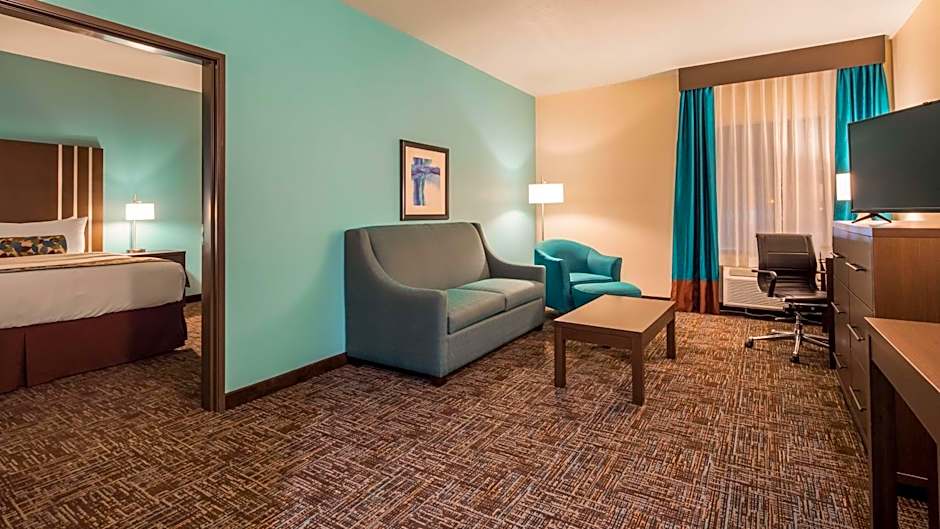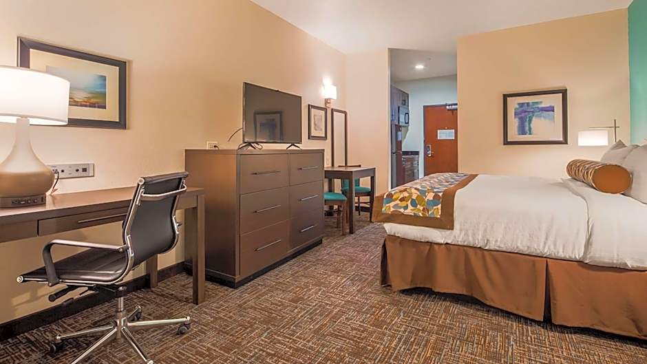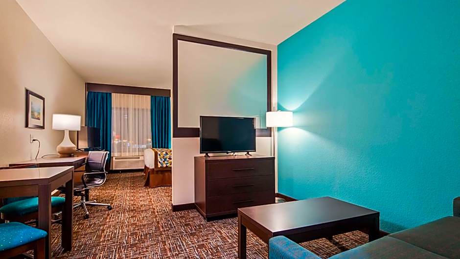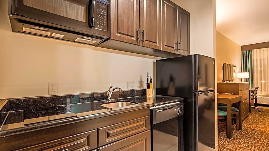 This suite features a flat-screen TV, microwave and coffee maker. The bathroom comes with a hairdryer.